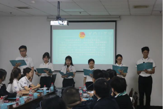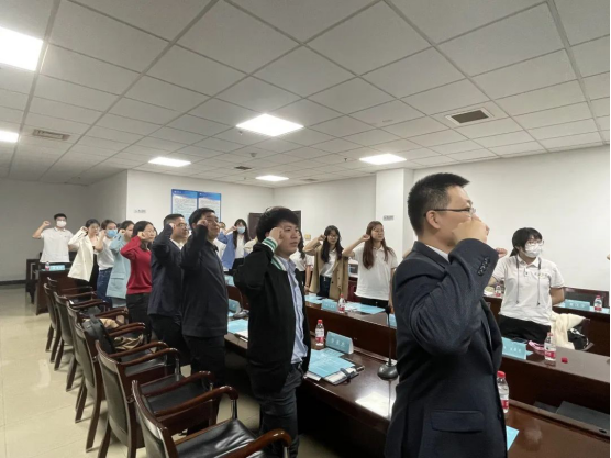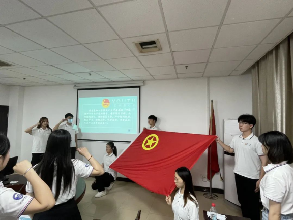 学生团委副书记黎文君同学的领誓下,两位新团员进行了入团誓词宣读仪式,其他与会人员重温了入团誓词,并齐唱团歌《光荣啊,中国共青团》。