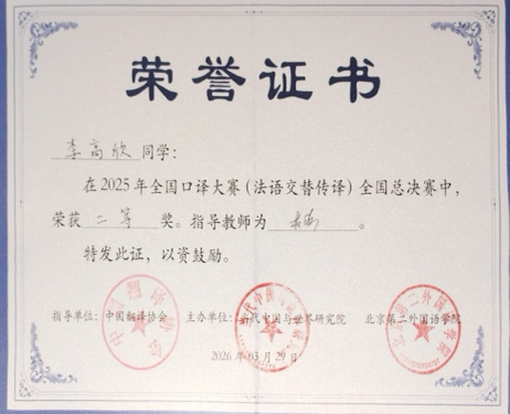 这份亮眼成绩离不开指导教师的悉心指导和学院完善的口译人才培养体系。法语系苏昉老师多年来深耕法语口译教学,主编出版多部法语口译专业教材。她担任指导教师,为李高欣同学量身定制训练计划,从赛题解析、口译技巧打磨到临场心态调整,展开全流程、全方位的专业指导。52书库