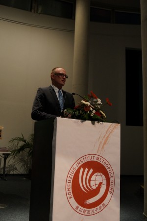 3月11日,鲁尔都市孔子学院成立五周年庆典在杜伊斯堡市科技大楼(Tec Tower)隆重举行,中国驻杜塞尔多夫总领事冯海阳、杜伊斯堡市长林克以及杜伊斯堡—埃森大学校长拉德克教授出席并致辞。前德国驻中国大使弗尔克·史丹泽博士、前德国联邦议会议员兼外交委员会委员约翰内斯·福鲁格先生、杜伊斯堡经济促进会主席莫雨勒先生、孔子学院的合作伙伴单位的同仁、朋友及当地民众100余人出席了庆典仪式。