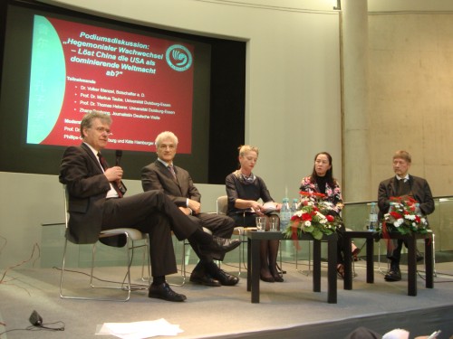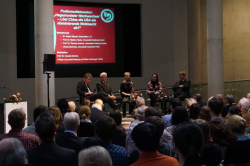 论坛就近几年来的中国社会、对外政策、经济政策和军事发展几个方面展开了讨论,这也是德国各界和当地民众最为关注的主题之一。史丹泽博士基于他在中国的经历与实践经验以及对中国的研究认为,中国不可能终结或取代美国的霸主地位。海贝勒教授也认同此观点,因为中国的未来走向尚不明晰,社会秩序在某种程度上还不稳定,军事实力在可见的时间内还较弱。在经济实力方面陶博教授认为中国在未来20年也难以取代美国,因为中国尚缺少世界经济领衔的人才。同时他认为中国面临两个方面的挑战:一是中国由于提高工人的工资,生产成本增加,需要摆脱“世界加工厂”帽子,导致许多外国公司企业外迁;二是结构转型后尚缺乏创新能力,但更缺乏的是创新机制。他还认为,中国采取引进西欧的公司企业来获得创新能力无疑是一种很好措施,但由于在很多欧洲企业人看来,中国尚未真正形成市场经济,外国企业难以得到公平对待,故给引进工作带来困难。史丹泽博士还补充道:在中国的很多省还存在某种地方保护主义,也是障碍之一。但他认为,中国的发展势头强劲,对外牵头成立了亚洲投资银行,并提出“一带一路”新丝绸之路的战略。海伯勒教授认为,“中国梦”是中国百姓的历史复兴之梦,他们为之奋斗并将在2020年之前实现由数量到质量的转变。张丹红女士就中国的社会现实进行了描述,她说,中国百姓生活水平大大提高,但也存在诸多的不安如:环境、食品、教育和社会保障等,这些问题尚需在发展进程中引起中国政府的重视并予以解决。就对外政策说来,中国的发展无疑会改变它的国际地位,它是世界的总企业,而且还会不断扩大。也许会有一天中国帮助德国兴建机场,而且又快又省钱。全场人都乐了!