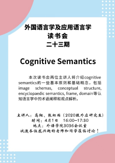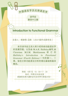 读书会最主要的活动是共读专业书籍。学生们在导师的指导下选定并研读一本专著,每周由学生提前设计海报(如下图)并进行宣传,学生介绍专著的部分内容,并在导师的指导下展开讨论,帮助学生形成完整的知识体系,加强理论功底的积淀。目前读书会已共读了认知语言学、系统功能语言学领域的两本专著:由Evans和Green合著的Cognitive Linguistics: An Introduction,以及由Halliday编写的Halliday’s Introduction to Functional Grammar。