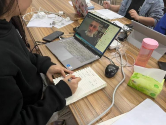 2023年3月5日,口译队五位成员喻静逸,黄晶晶,石悦,吕成乐,施钰雯报名了这次项目。3月6日,五位同学开始进行译前准备,提前熟悉老师的课件和相关术语等。本次同传持续两个小时,由五位同学接力进行。以石悦,喻静逸,黄晶晶,吕成乐,施钰雯五位队员按顺序接力,每人进行了15至30分钟左右的同传翻译。3月10日,在队长黄雨彤同学的帮助下,基于充分的译前准备,五位同学进行了较好的实战配合,使得该项目的第一次线上同传的获得成功。