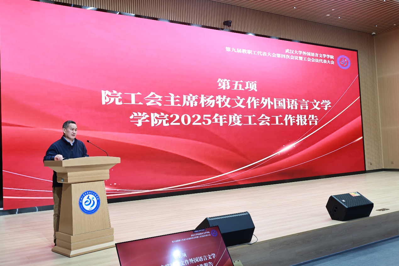 2025年度教代会与工会工作报告。他总结了2025年学院工会在加强思想政治引领、完善教代会建设、推进民主管理、关注教职工民生、丰富校园文化生活等方面的工作成绩。一年来,工会通过 “三级联动、三位一体”工作模式,组织各类文体活动与慰问帮扶,选树师德典型,提交多项提案助力学院发展,荣获多项校级文体比赛奖项。明确了2026年工会工作思路,将持续强化党建引领,深化民主参与和监督,加强文化阵地建设,提升工会服务效能,凝聚全体教职工合力助推学院高质量发展。