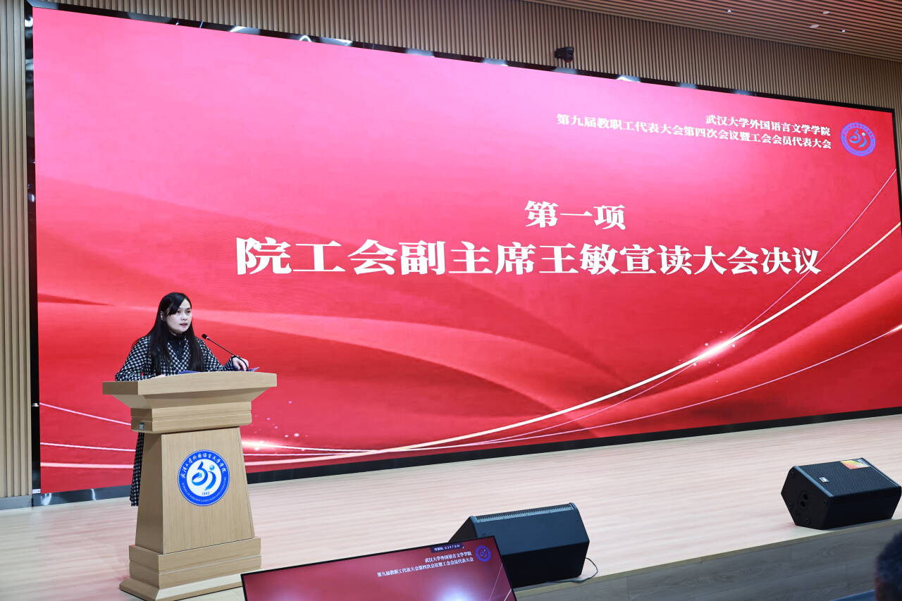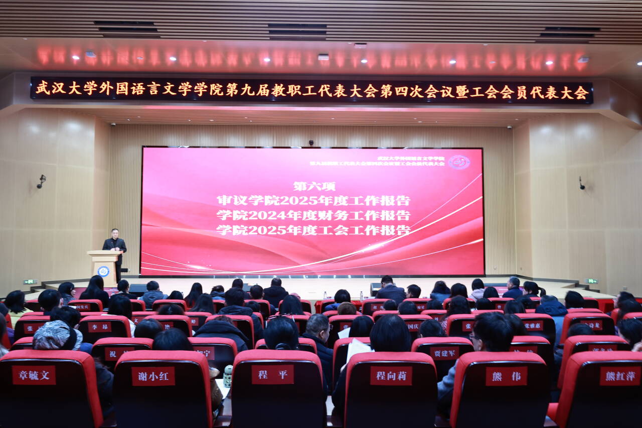 院长李圣杰作题为《凝心聚力,踔厉奋发—全力谱写学院事业高质量发展新篇章》的学院工作报告。他全面总结了学院2025年度在党建引领、人才培养、学科建设、师资队伍、科研工作、国际交流、管理服务等方面的主要工作成效。报告指出,2025年作为“十四五”规划收官、“十五五”规划启动之年,学院以“深化改革年”为主题,以内涵式发展为主线,学科竞赛斩获多项国家级奖项,毕业生就业率位居全校前列,科研经费与高水平论文数量稳步增长,人才引进与培育成效显著。同时,明确了2026年重点工作思路,提出将围绕“十五五”规划实施,深化“外语+” 复合型人才培养模式,做好第六轮学科评估迎评工作,推进党建与事业发展深度融合,全面提升办学水平与学科核心竞争力。